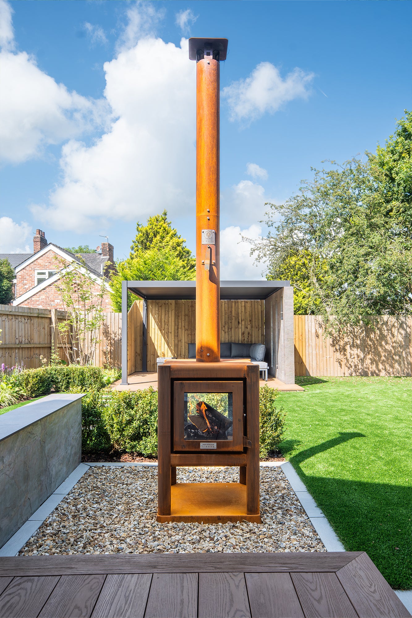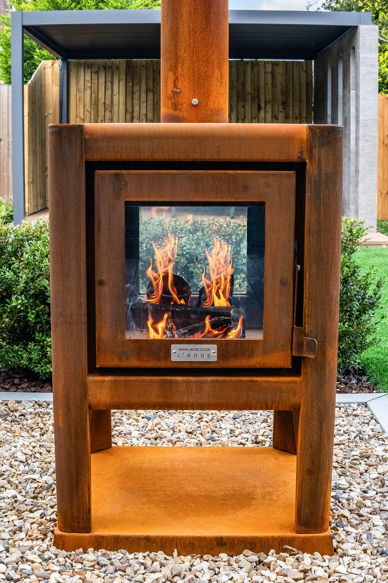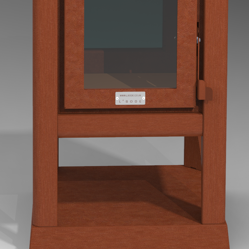 The updated L'Bode Cube Corten finish outdoor log burner is ideal as a central focal point where seating can be arranged around the fireplace with all 4 sides of the fireplace perfectly framing the fire and giving everyone the perfect view whilst enjoying the heat from this high heat output model.